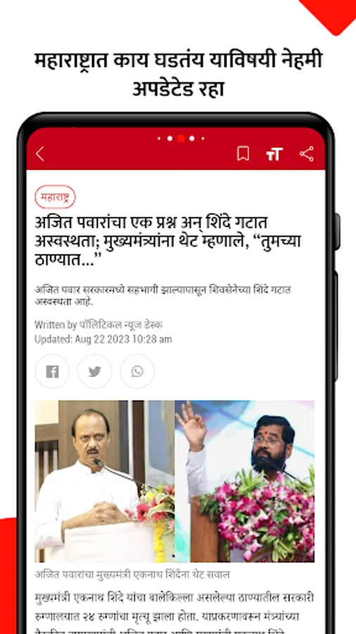 Stay ahead of the curve with your daily dose of Marathi news and Epaper, ranging from local to global stories. From breaking news to in-depth reports, we've got it all covered. Dive into Maharashtra news, politics, elections, sports, entertainment, business, astrology, women, ganesh utsav, Cricket world cup 2023, personal finance, UPSC and MPSC and many more.