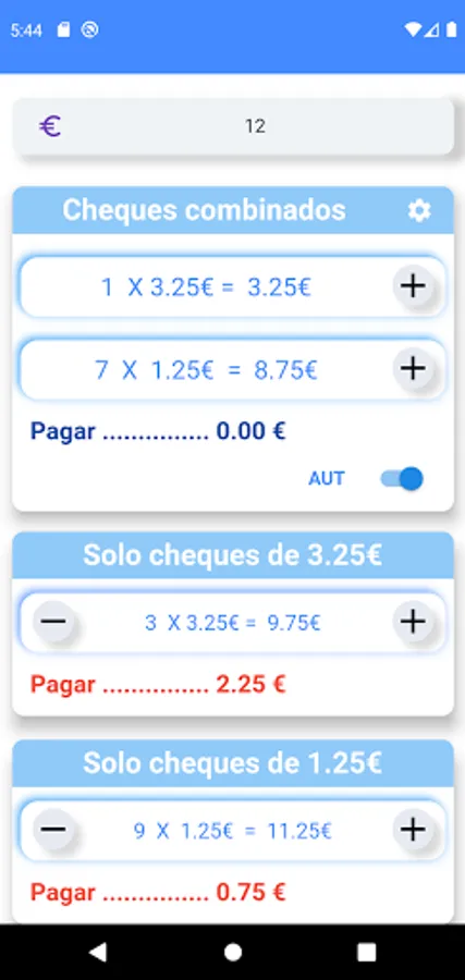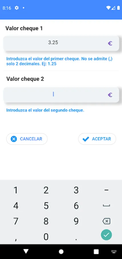You can enter up to two different check values at the same time, this allows you to calculate the amount to be paid by combining two checks of different value in €.