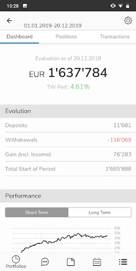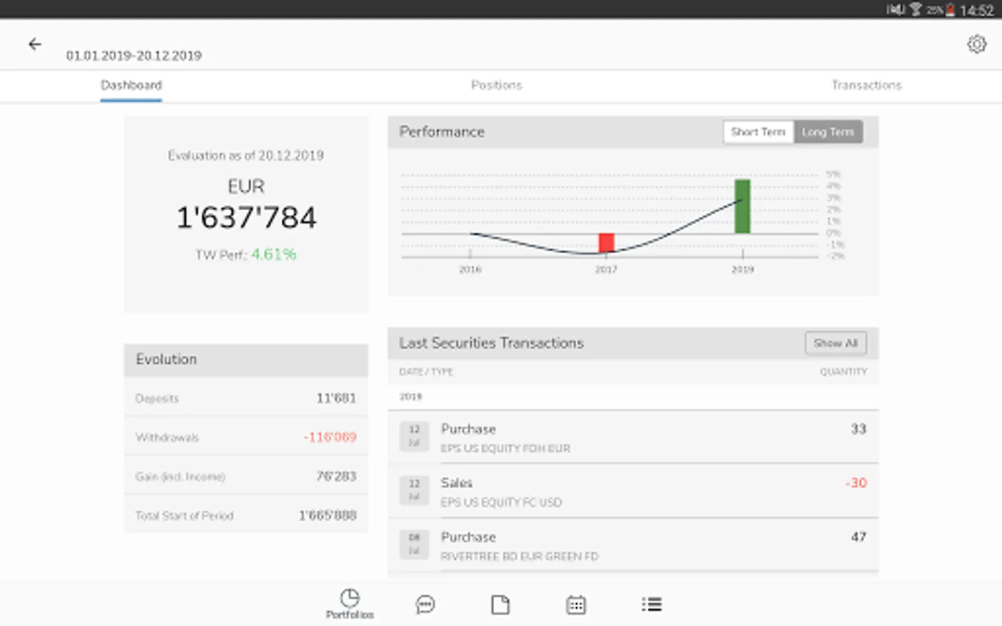 - A detailed analysis of one or more consolidated portfolios, their exposure by asset class or per currency, their performance and their transactions;