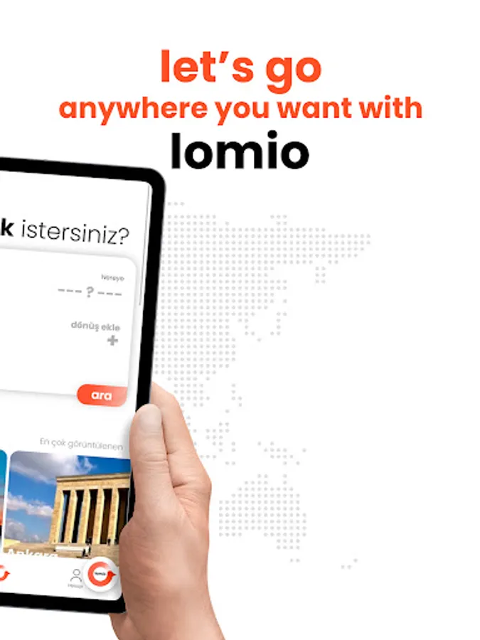 Lomio ile yurt içi ve yurt dışı uçak biletlerini, otobüs ve tren biletlerini karşılaştırabilir, rezervasyon yapabilir ve dilediğin yere seyahat yapabilirsin. Ayrıca araba kiralayabilir dilediğin yere, dilediğin zaman ulaşabilirsin. Her türlü seyahat avantajı lomio.com mobil uygulamasında!