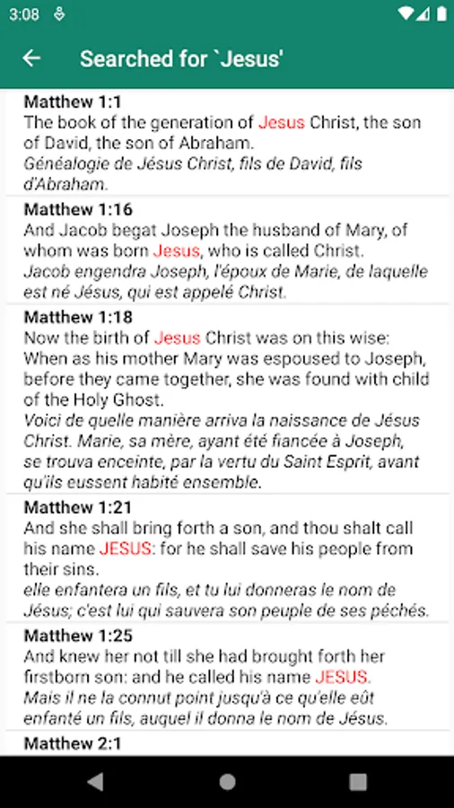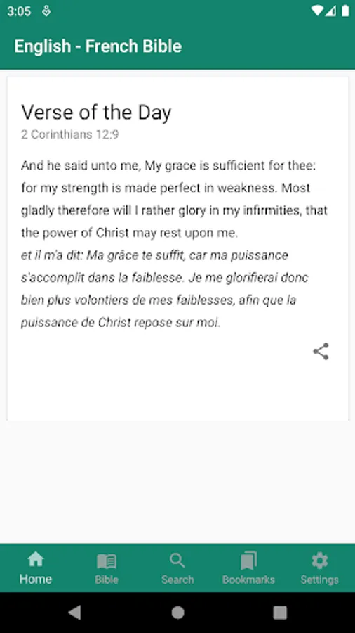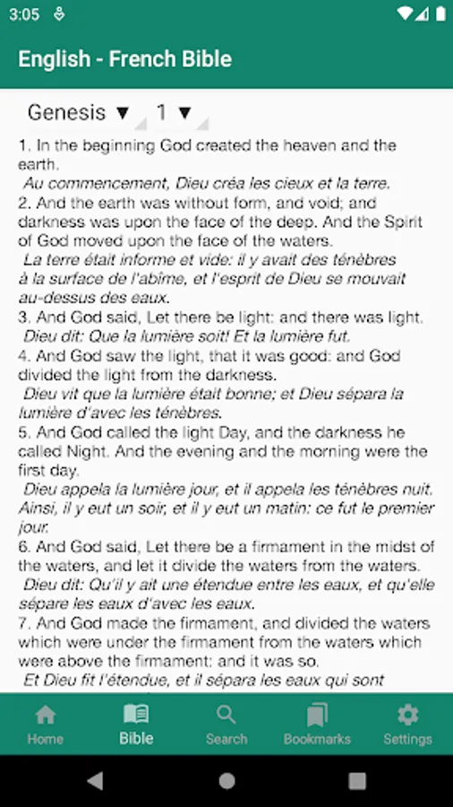Carry the entire multilingual King James Version (KJV) Bible in English and French in your android device. Wake up everyday to a new, inspiring and motivating Bible Verse.