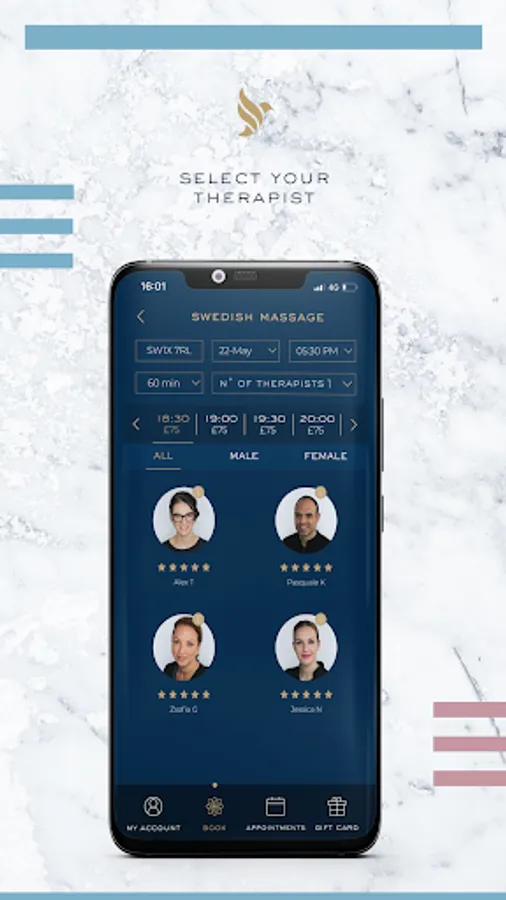 With a few clicks, Sign up - Select your treatment – date and time – select your therapists and then confirm. If a therapist is not available for the time chosen, you can send a Live request and this will check with therapists around you if they can still cater for your request.