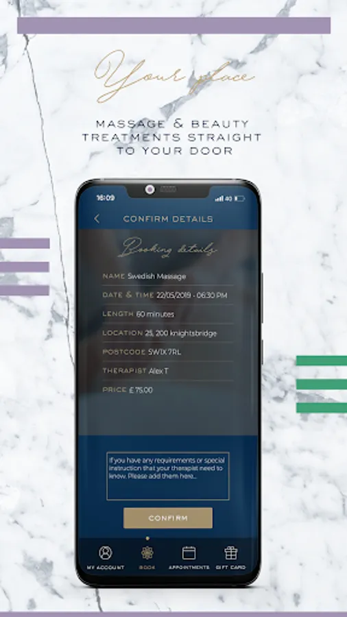 Catering for celebrities and VIPs amongst others, we know what a luxurious treatment is. The App allows you to book all our treatments with a few simple steps.