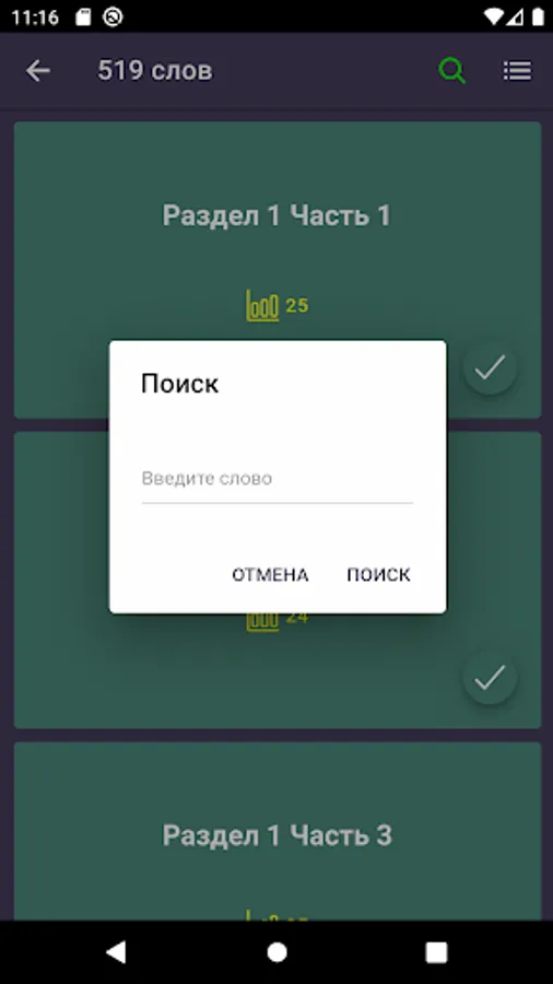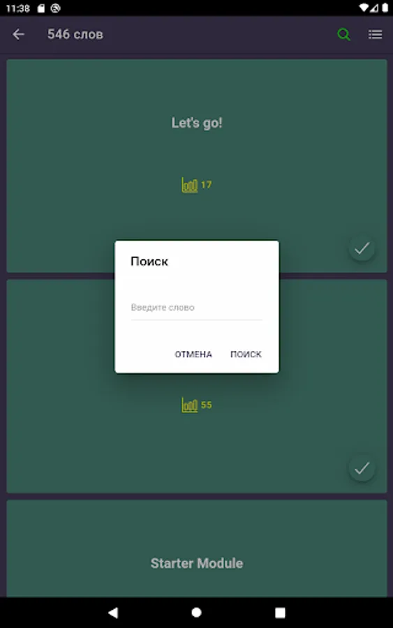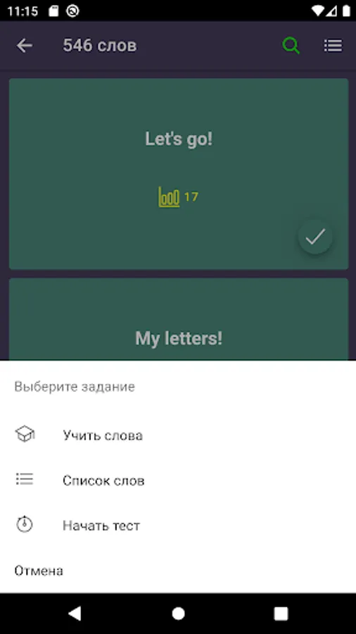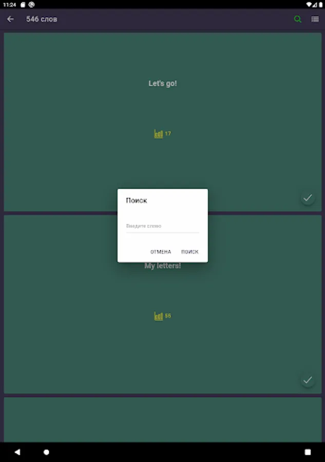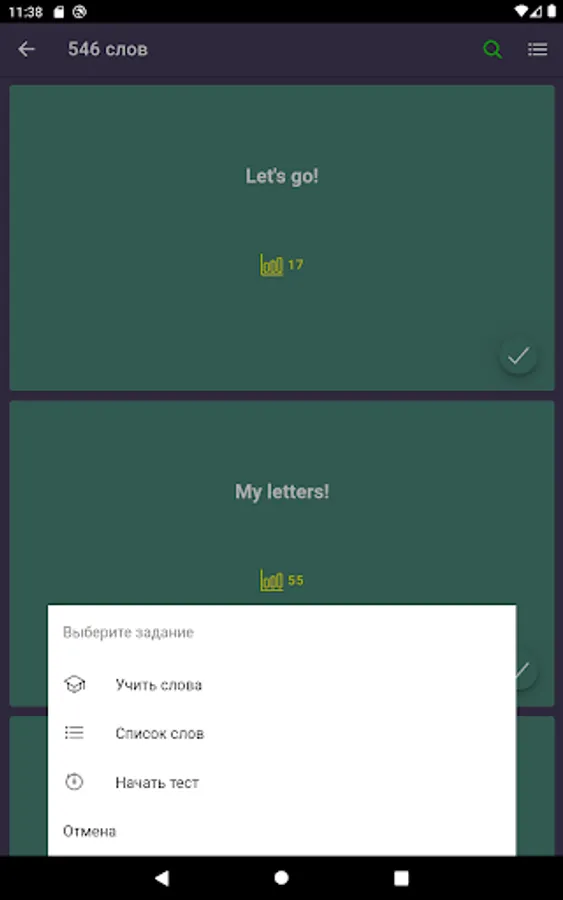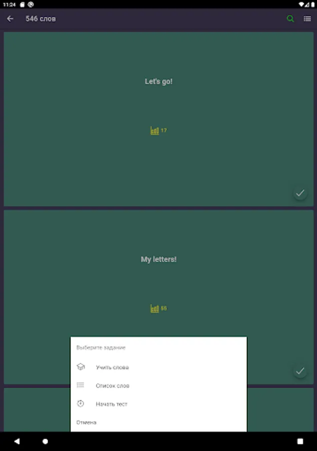 4) After studying, you can proceed to consolidation. More than five tests of different difficulty levels will help to develop listening skills, correct spelling and translation.