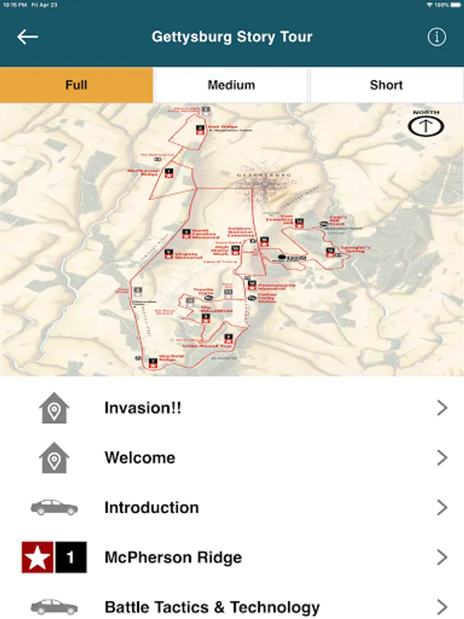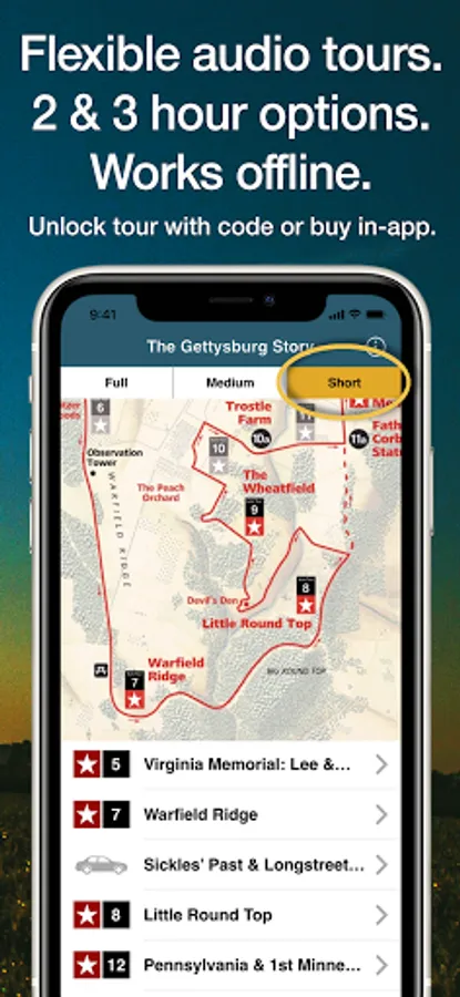 • Short, Medium & Full audio tour versions ranging from 2 to 3 hours covering the Gettysburg National Military Park official Auto Tour Route.