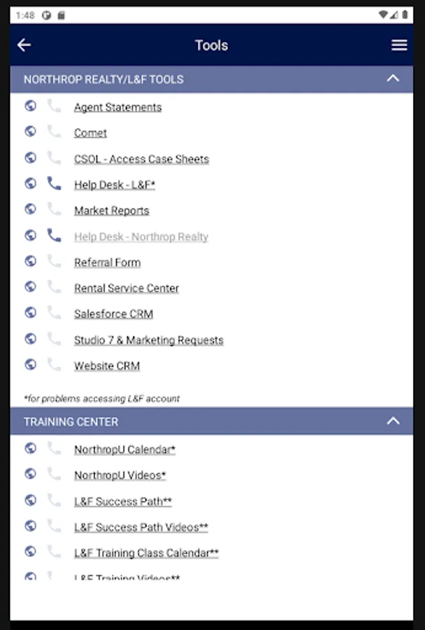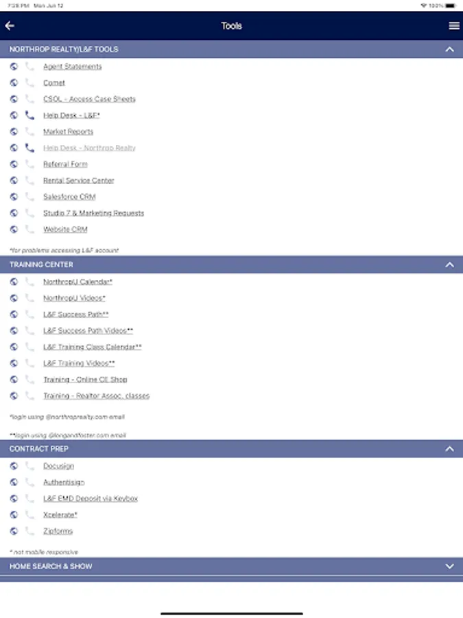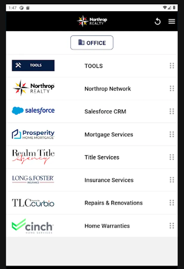 Northrop Realty real estate agents can quickly connect to the contacts, programs and websites you need to conduct business from your mobile phone and tablets using Northrop Realty CONNECT. Designed to help our agents be more efficient and effective while working from wherever you are at the moment … use Northrop Realty CONNECT while meeting with a client, previewing and showing properties, hosting an open house or any time you need to quickly accomplish a task. Just click to call, email or text your Prosperity loan officer, Realm title attorney or your Long & Foster Insurance agent, calculate closing costs, check mortgage interest rate trends, and access the Intranet Hub along with many of your favorite programs. Multi-tasking while you are on the move has never been easier with the Northrop Realty CONNECT app