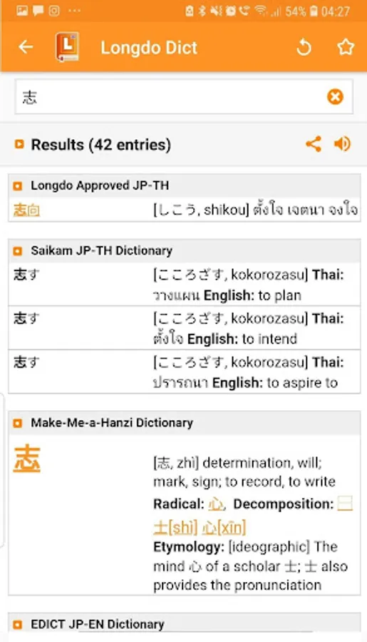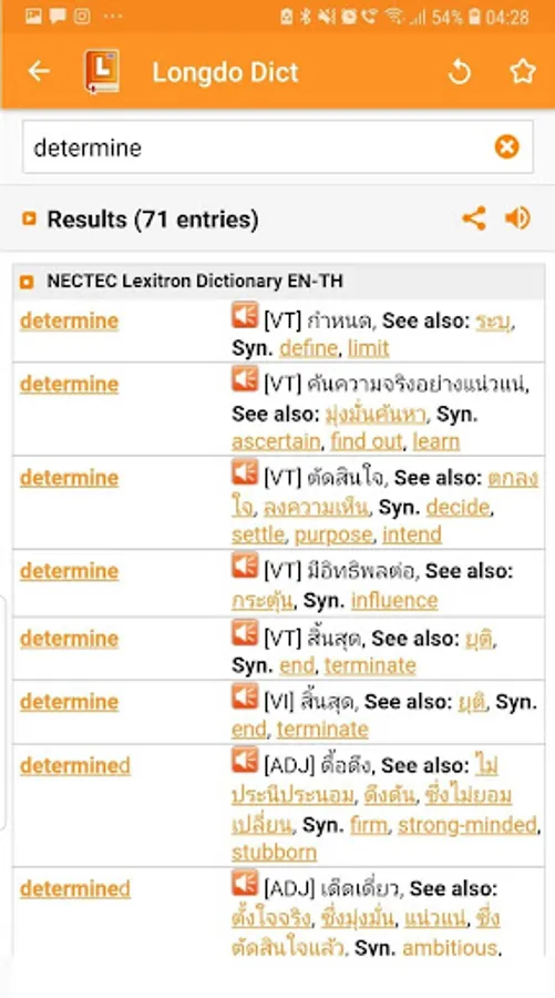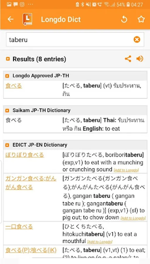 Longdo Dict is an official Android client to the popular Longdo online multilingual-Thai dictionary service at http://dict.longdo.com/. It provides online and offline access to multiple bilingual dictionaries between Thai and non-Thai (English/Japanese/French/Chinese/etc.) languages.