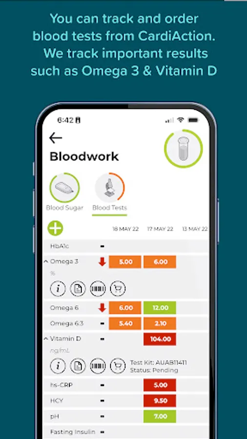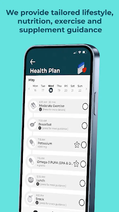 Your individual health interventions, including lifestyle, exercise, nutrition and supplement guidance will be presented in this CardiAction app, helping you to follow your tailored health regime.