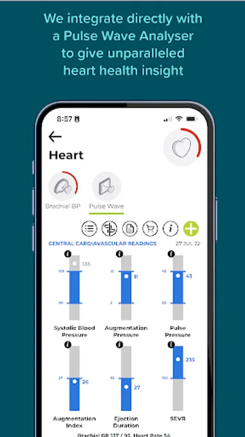This app gives you access to all your CardiAction readings taken during your pulse wave analysis sessions. The app presents the most important aspects of the pulse wave reading and educates you on the importance of improving these metrics for better heart health.