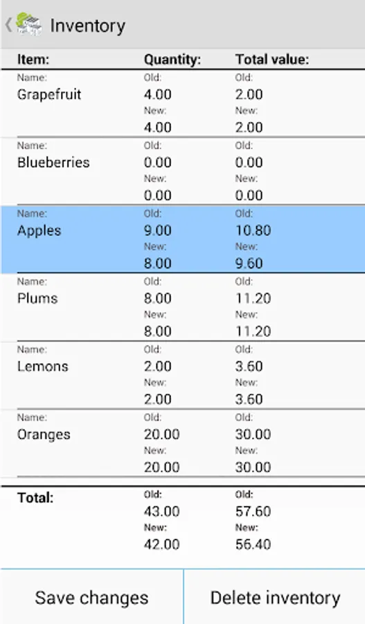+ report on differences before and after the inventory, with the items with different stock levels marked in colour and a recap of differences and values
