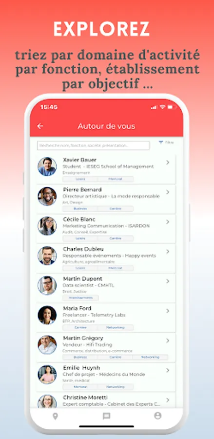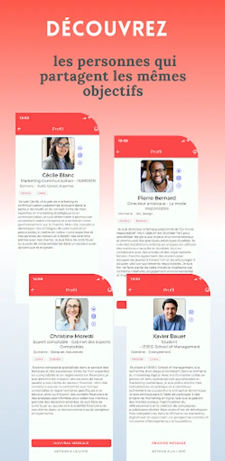 Explore attendees' complete profiles, discover their shared skills and interests, and access their social networks directly to expand your professional connection. By opting for our freemium subscription, you will be able to see the photo, the name and the first name of the participants. For a more advanced experience, our monthly subscription allows you to access all attendee information and communicate with them before and 24 hours after the event. Choose our annual subscription and get a 48-hour window to connect with attendees after the event.