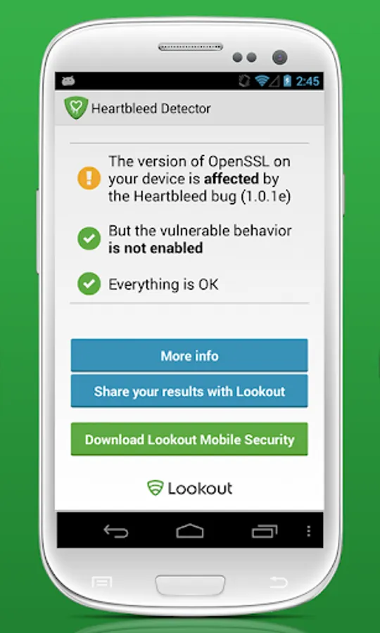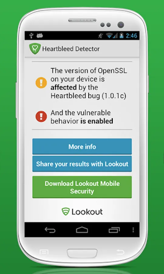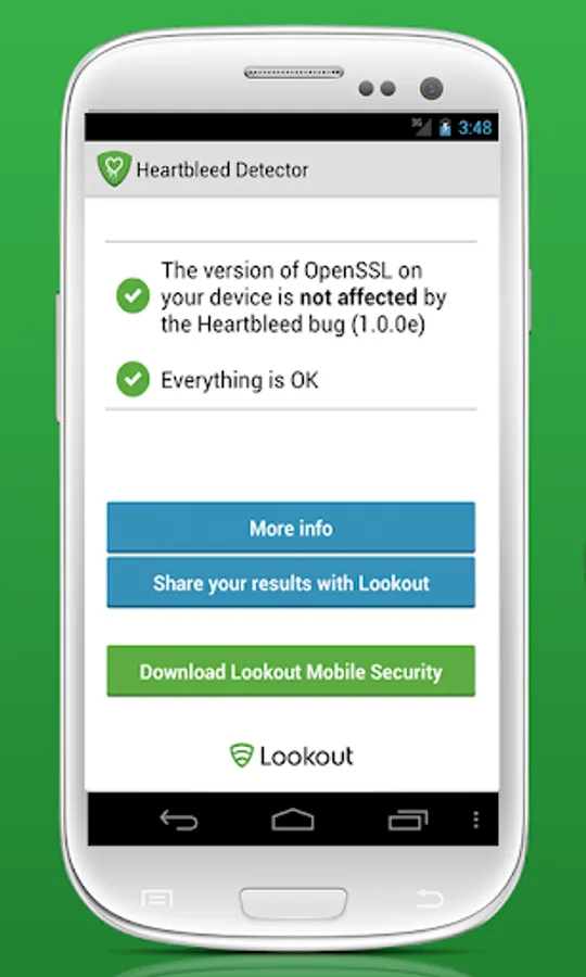 Heartbleed Security Scanner is not meant to fix this vulnerability, as the vulnerability will need to be patched by Google or your device manufacturer. Heartbleed Security Scanner is only meant to keep you informed about the status of your device. The good news is that Lookout has not yet seen the Heartbleed vulnerability exploited on a mobile device.