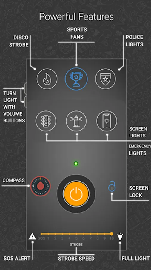 Built-in compass, strobe and many other powerful features. This is a serious swiss-army flashlight app - a real life saving tool!