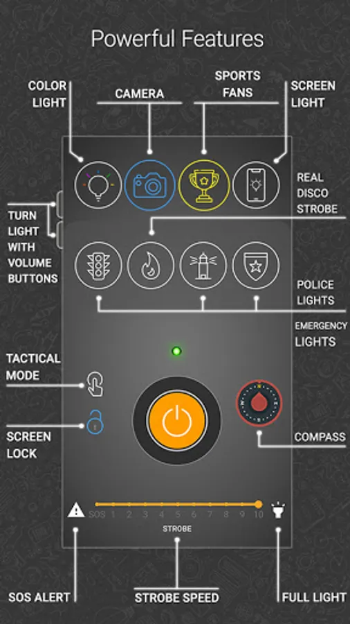 A beautiful, simple and safe flashlight torch app. Built-in compass and camera, strobe, tactical mode and many other powerful features. This is a serious swiss-army flashlight app - a real life saving tool!