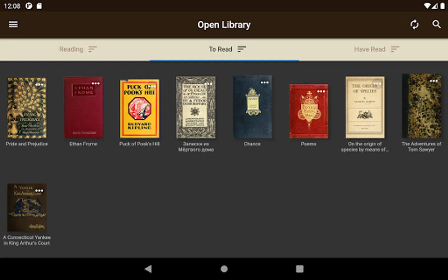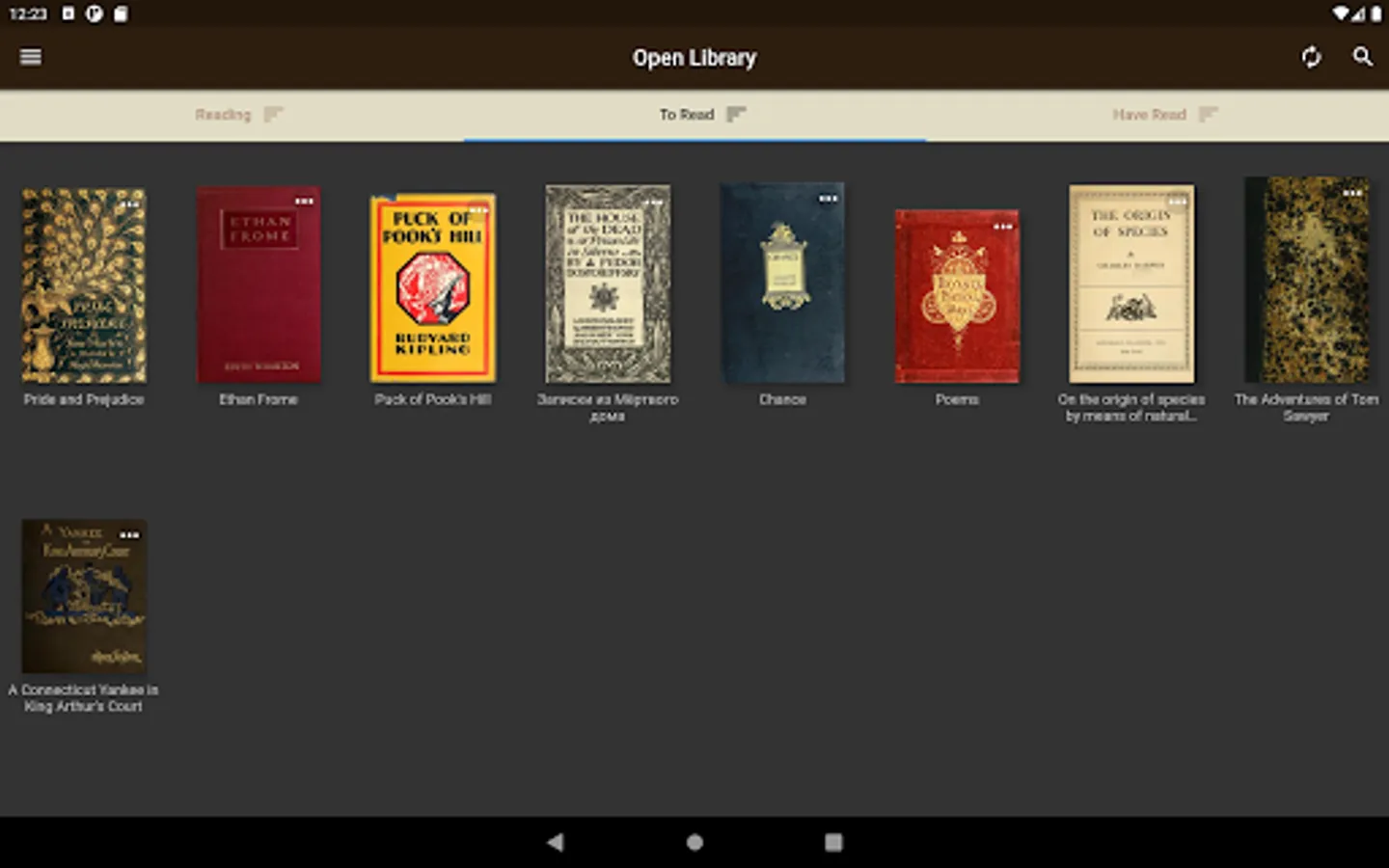 The moment you open the app and log in, any books you've already saved on the Open Library site are laid out on your screen. You can sort them by title, author, publication date, and date saved, see which books are available to read, and open them with a single tap.
