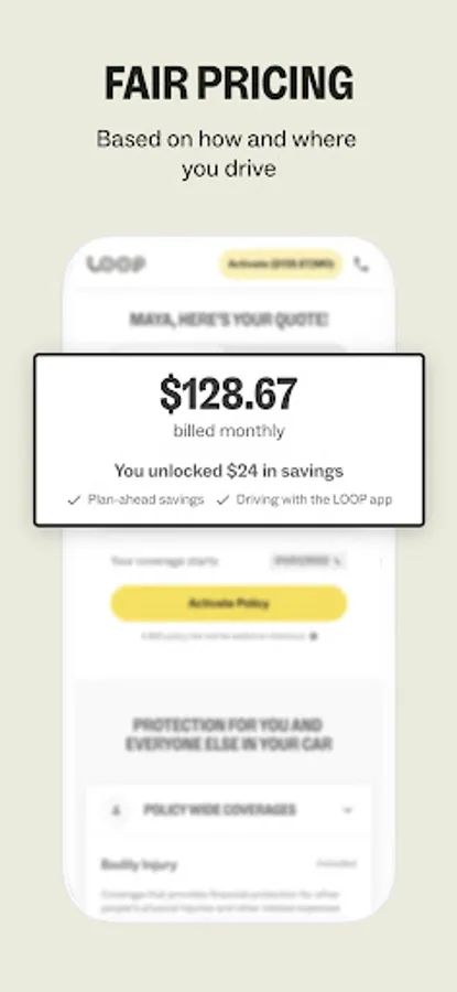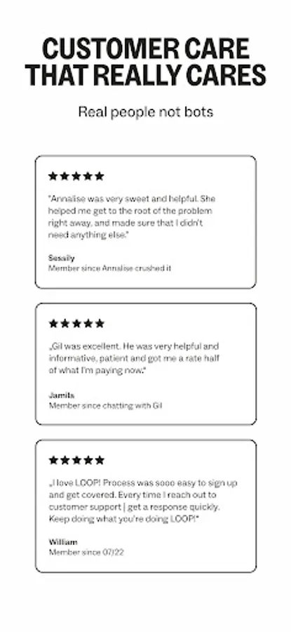 Download the LOOP app to get your car insurance quote in 60 seconds, get fully insured in 5 minutes, get personalized safety tips, access your digital insurance card, policy documents, and so much more.