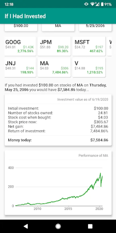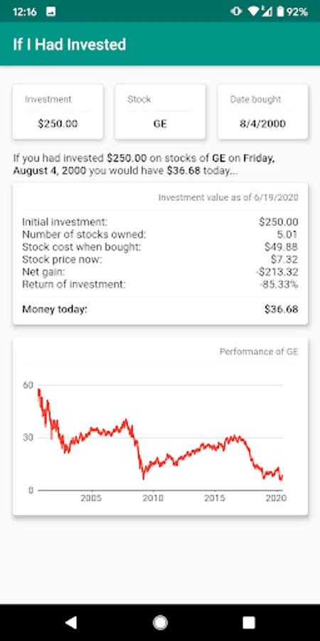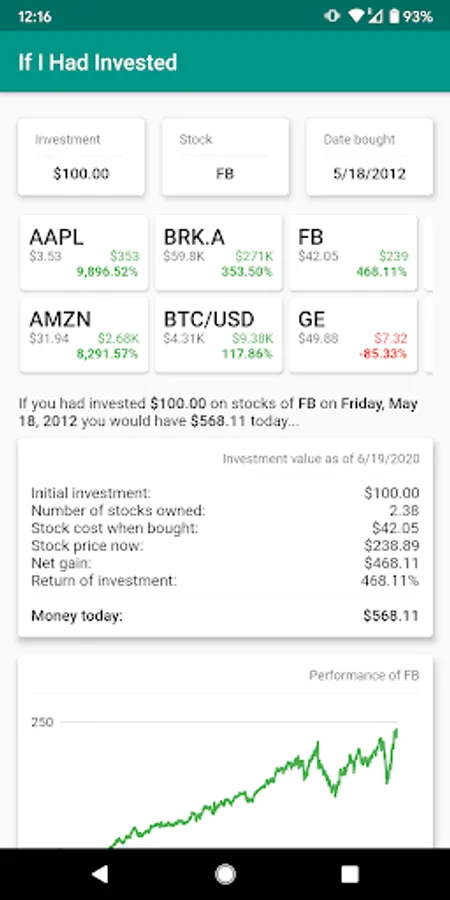 It also shows a small graphic at the bottom card with the performance the stock has had over the years, allowing you to change the date you'd like to enter as your initial investment date.