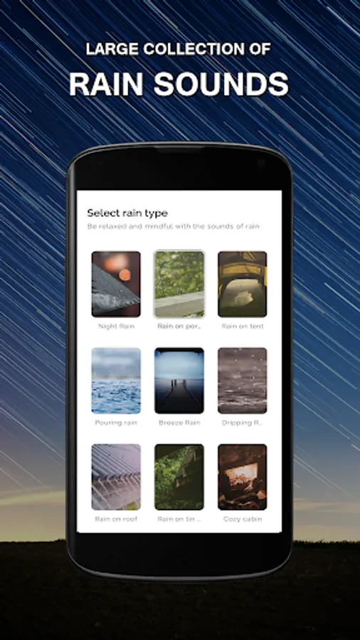 You can choose from more than 30 rainscapes, carefully selected and professionally mastered to calm you down. The sound levels and the spectrum are specially tuned to help you refresh and drown out any distraction noises from outside.