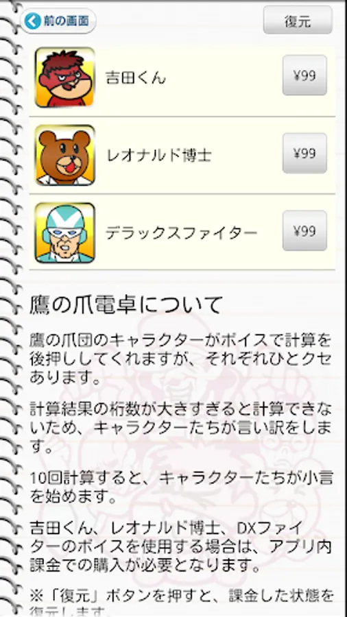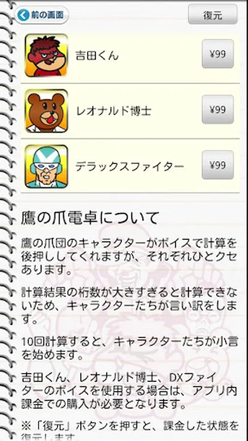 If you want to use the voices of Yoshida-kun, Dr. Leonard, and DX Fighter, you need to make an in-app purchase.