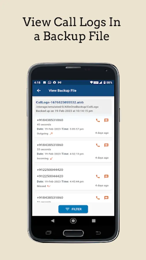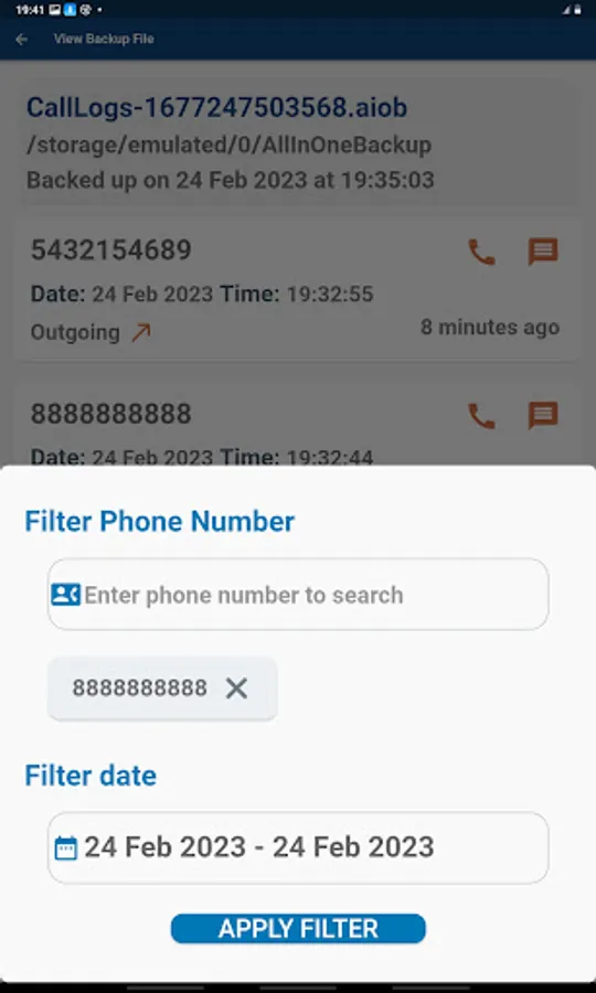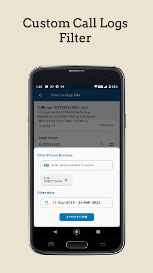 - Filter and view call logs in your backup file based on date range of your choice.