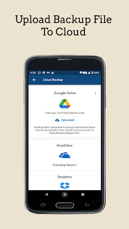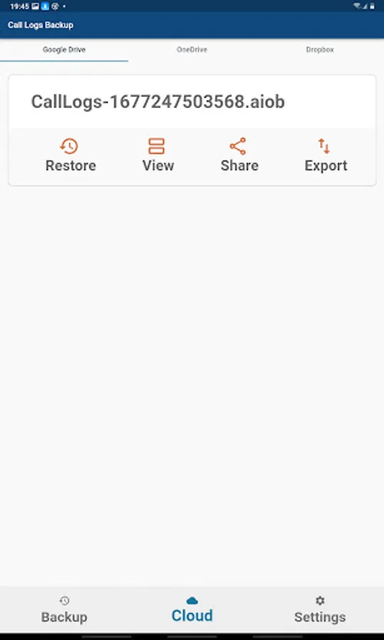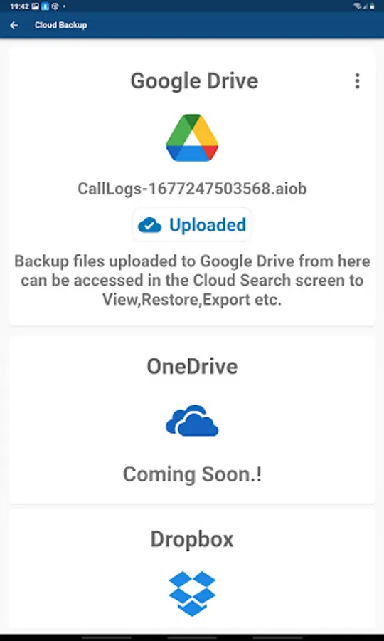 - Access your backed up call logs data uploaded to Google Drive from within the app.