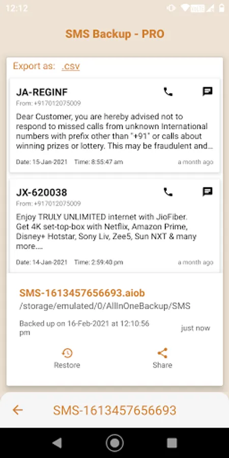 (*Please note that .csv files cannot be used to restore sms. Only .aiob files can be used to restore sms which ensures safety and authenticity of your sms data).