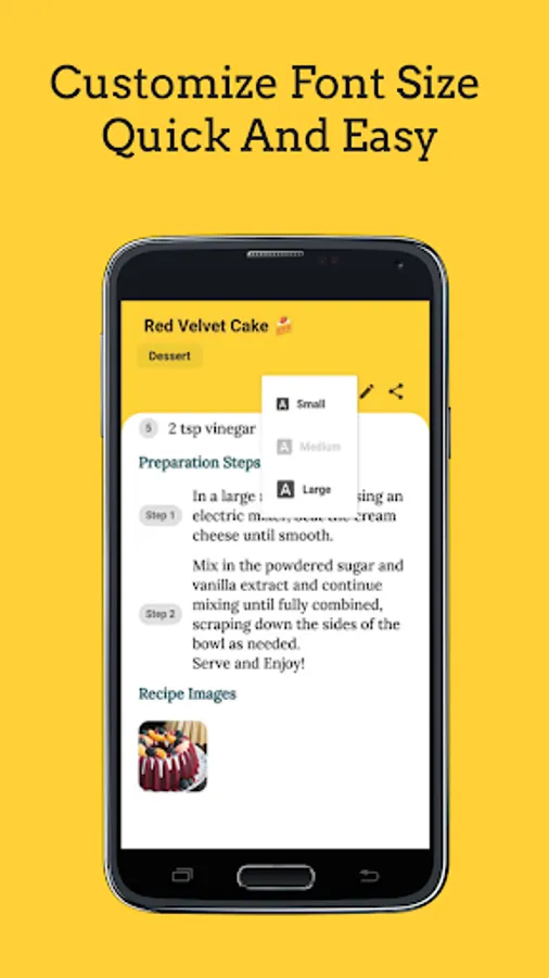 Recipe Factory allows you to view your recipe notes with customizable font sizes. You may now also have your mobile at a safe distance from the cooking space and still see the recipe without straining your eye.