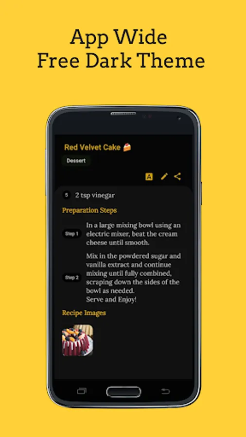An app-wide Dark Theme helps you note down and view recipes in dark ambiances without straining your eyes and also advertently saving your phone's battery.