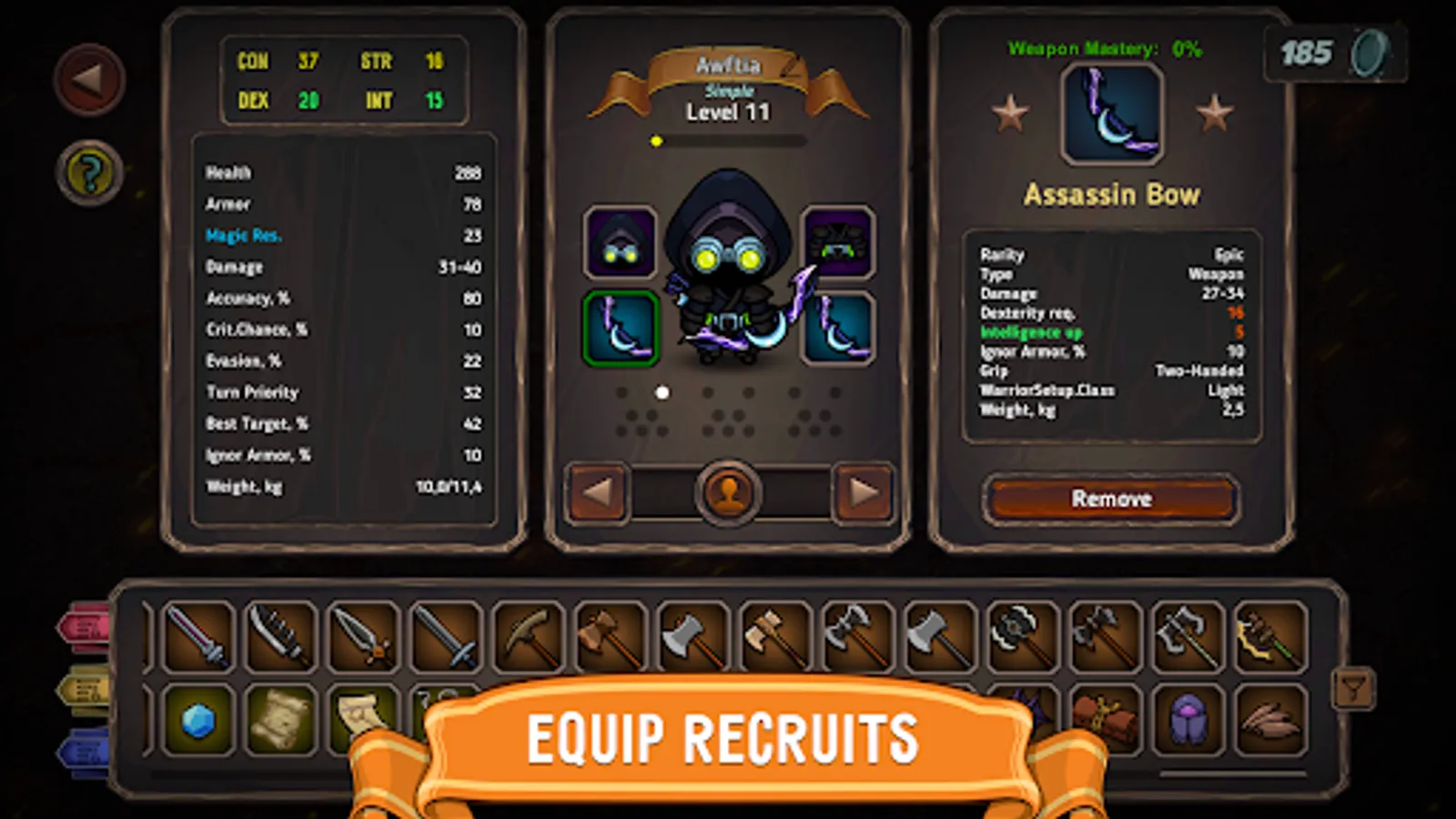 Hire, level up and gear up warriors, equip them with half a thousand of Unique weapons and armor. Each warrior can be customized to have an original style and skillset.