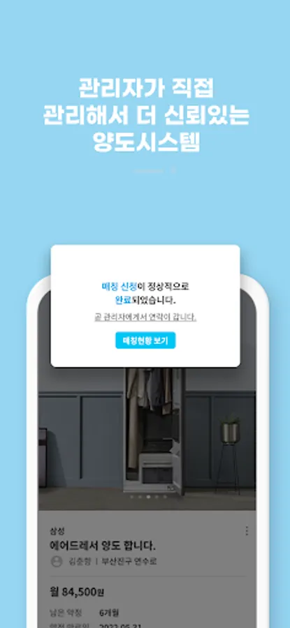 Cantal Market connects the transferee (consumer) who inevitably wants to cancel the contract within the long-term contract period (3 to 7 years) for the rental product with a contract and the transferee (consumer) who wants to transfer the contract, and within the contract period during rental This is a service that transfers without penalty for cancellation and connects the transferee who wants a shorter rental period for the same amount of the existing rental fee.