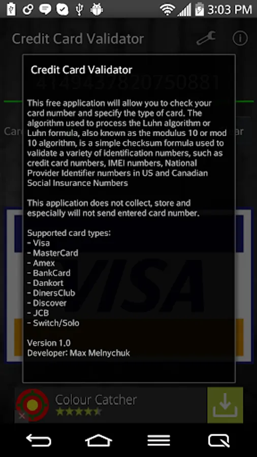 This free application allows you to check your card number and specify the type of the card. The algorithm used to process the Luhn algorithm or Luhn formula, also known as the "modulus 10" or "mod 10" algorithm, is a simple checksum formula used to validate a variety of identification numbers, such as credit card numbers, IMEI numbers, National Provider Identifier numbers in US and Canadian Social Insurance Numbers