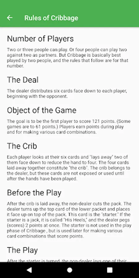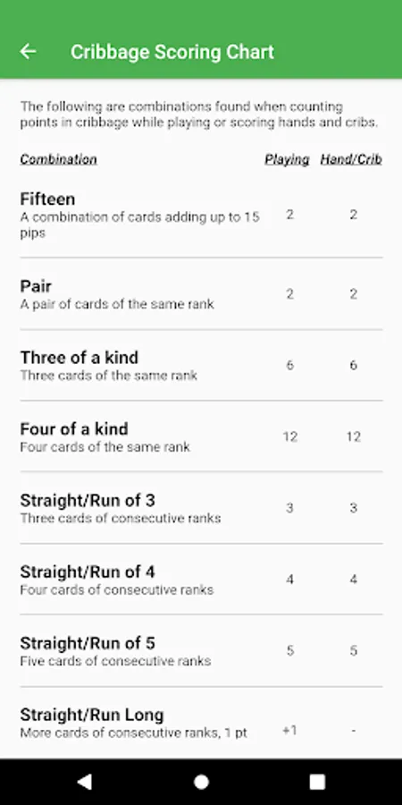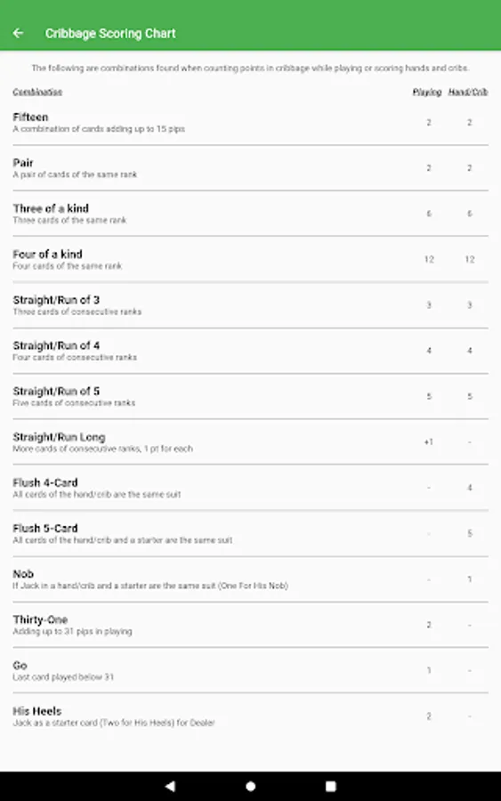 The Cribbage Scoring Pegboard app also includes cribbage rules of the game and a handy cribbage scoring chart for easy reference. Making this a great companion app for playing cribbage. So grab a deck of cards, this app, and have some fun!