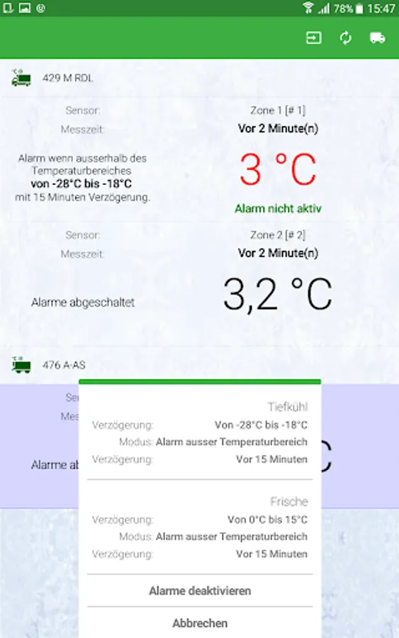 Application is intended to be used with LOSTnFOND® refrigerator temperatures monitoring solution. It allows to efficiently monitor refrigerator temperatures of every vehicle in your fleet. In addition vehicle temperature alert thresholds can be defined for each temperature sensor separately.