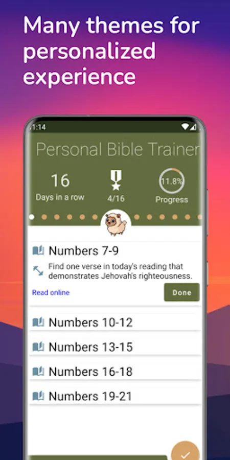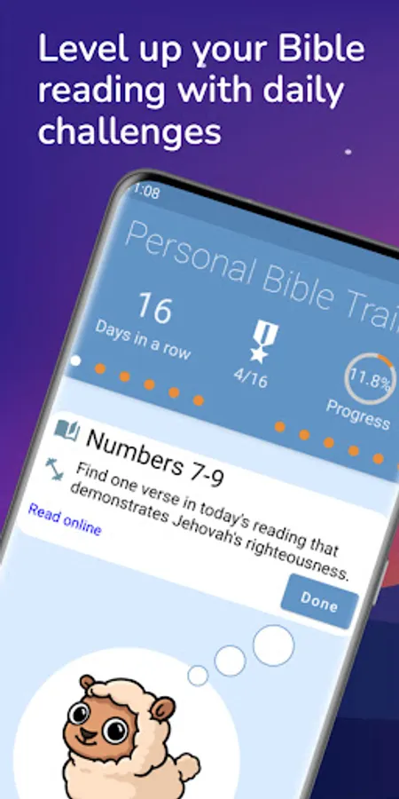 Make your Bible reading more fun and engaging with daily challenges, achievements, and reminders to keep reading each day. Choose from different schedules to find a reading pace that suits you.