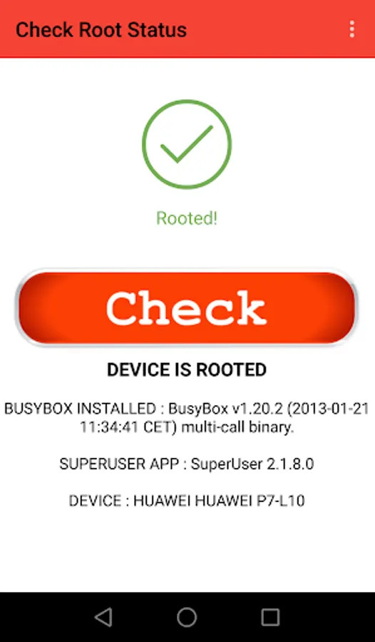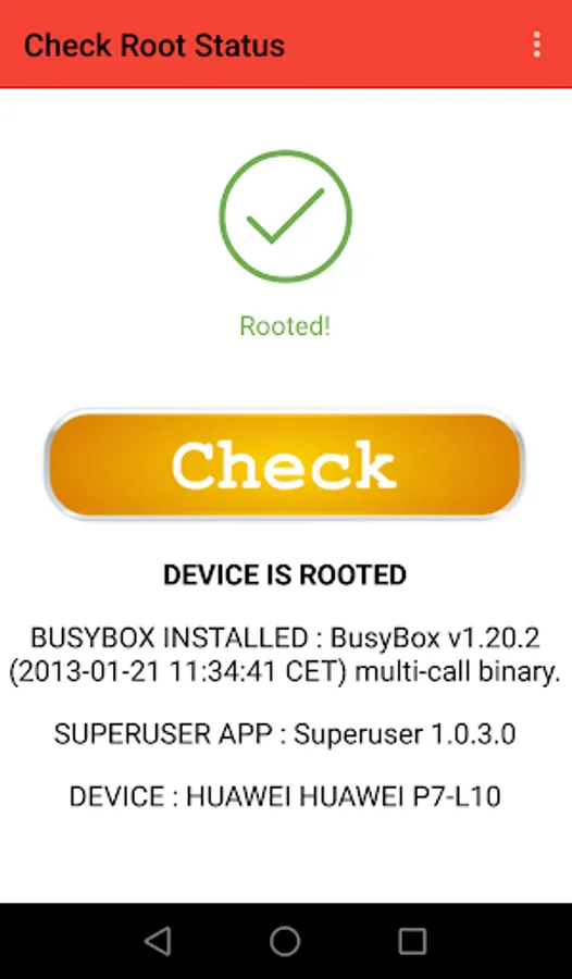 Check Root Status is a simple app that allows Android users to check if their OS is rooted or not (Check for SuperUser/SuperSu).