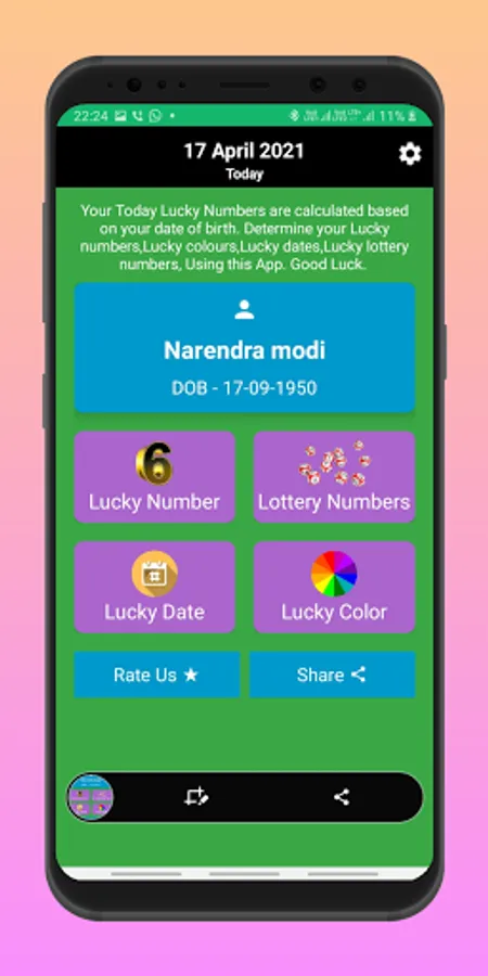 This app will generate your six lucky numbers every day based on your date of birth using a very complicated and secret Algorithm