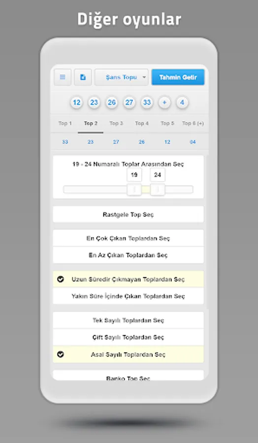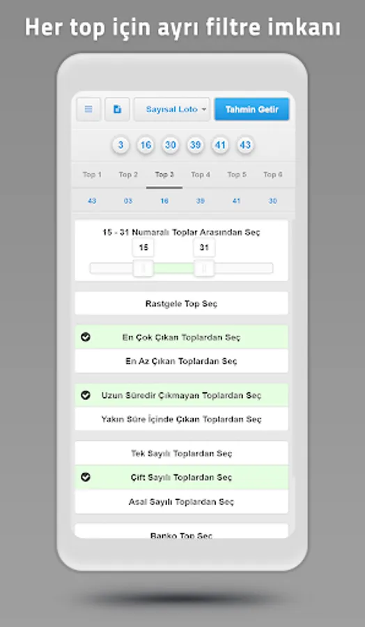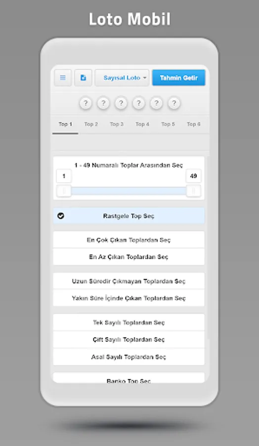 Lotto Mobile; Numeric Lotto, Super Lotto, Ten Number and Lucky Ball is an application that generates estimates based on your selected filters.