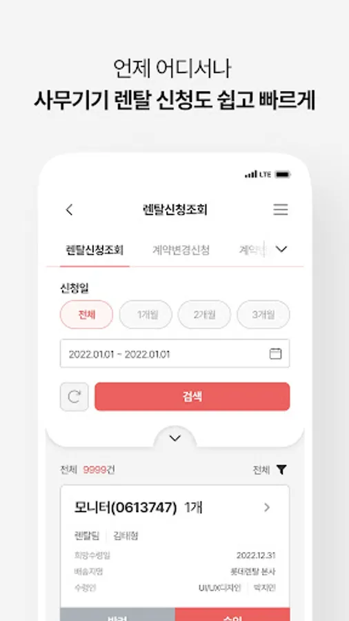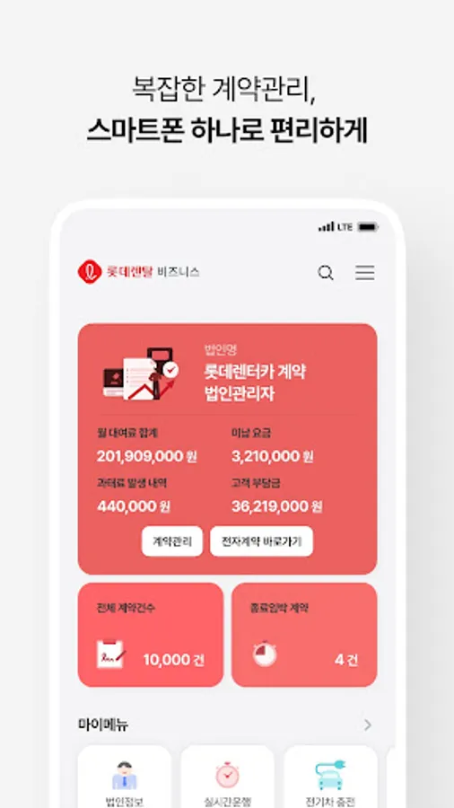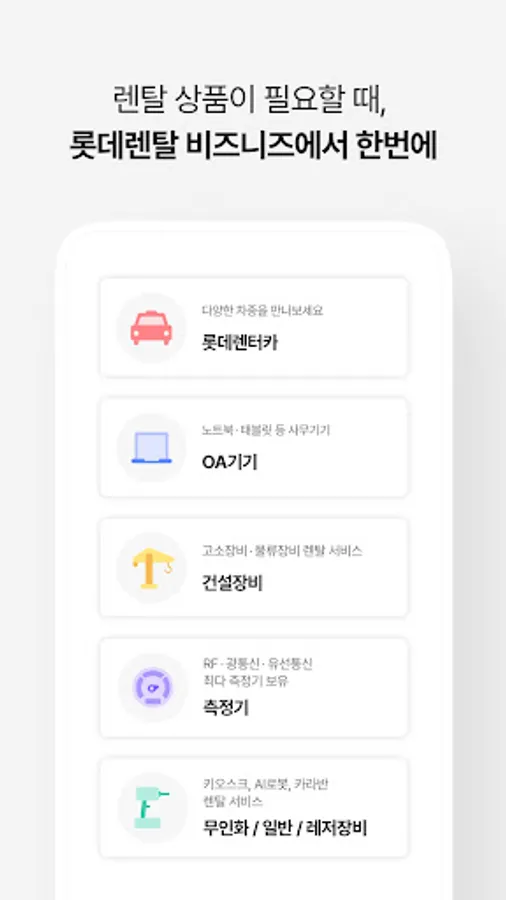 Easily solve complicated tasks with Lotte Rental business, which handles all vehicles, OA devices, construction equipment, measuring instruments, and unmanned/general/leisure equipment from quote inquiries to contract management!