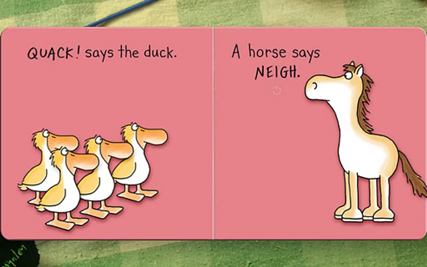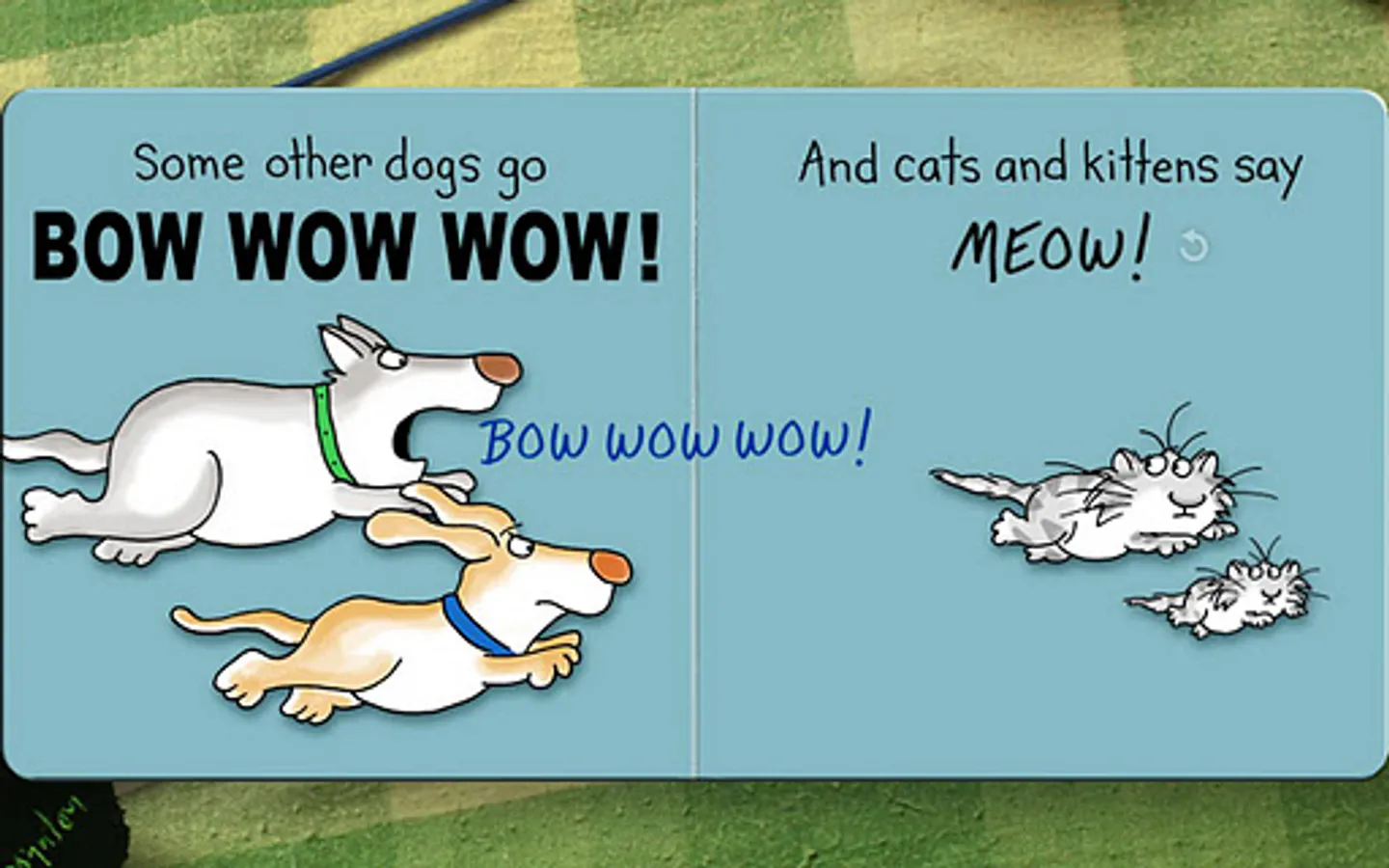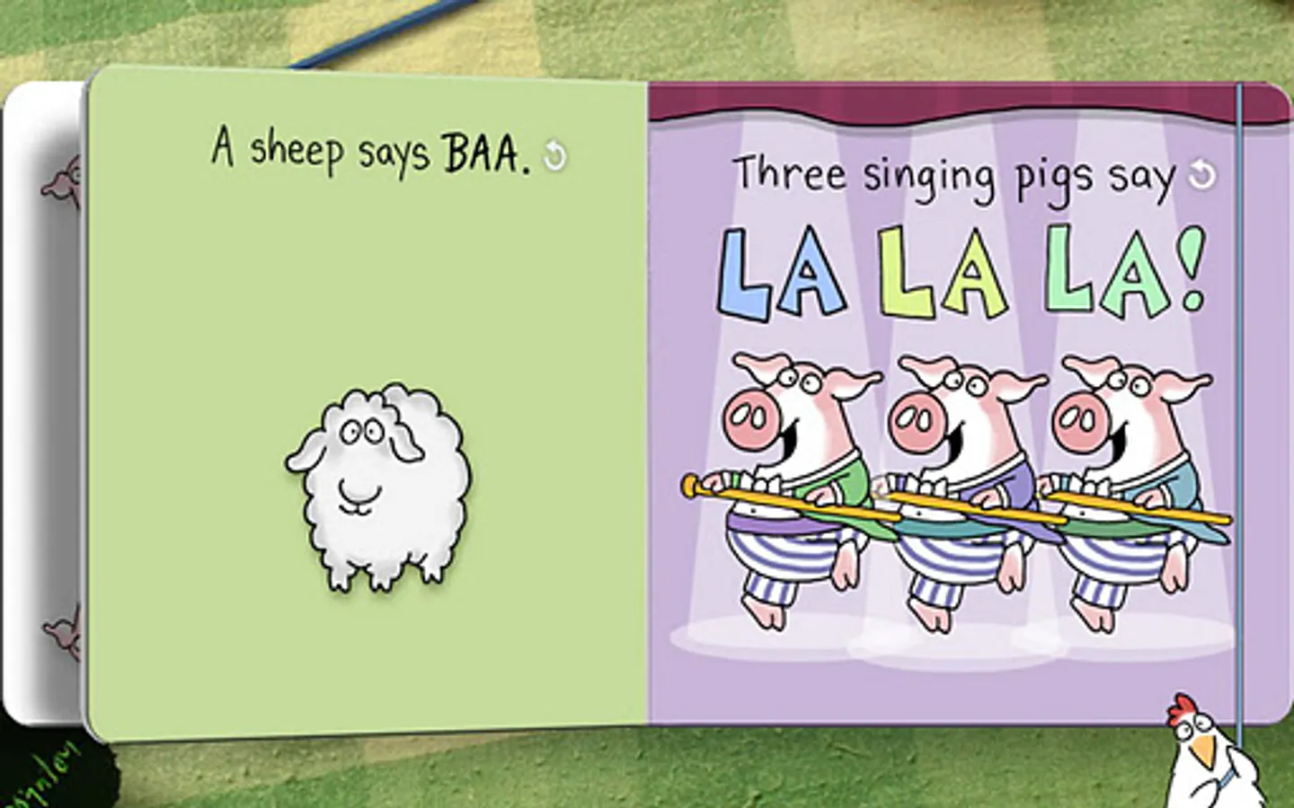 Far beyond any e-book experience, the Moo, Baa, La La La! interactive book app has all the magic and appeal of a traditional pop-up book, offering lively interactivity and nifty discovery. Of course you can hear each animal make its unique sound. (In some cases, VERY unique.) But there’s more! Help the perplexed chicken stagehand raise the curtain on a stageful of dapper dancing pigs. Turn day to night with the touch of the moon. Slingshot the running cats away from the barking dogs. A touch of the duck activates a quack which brings in another duck. Then another. And yet another. Even the back cover has a curiously articulate spokesman that you really mustn’t miss.