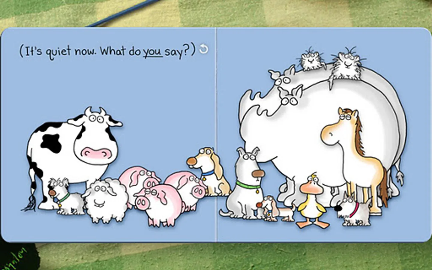 JUST MOO IT! Sandra Boynton’s best-selling book of all time comes alive with sound and movement and gloriously unpredictable interactivity. The wryly inventive Moo, Baa, La La La! digital book app will intrigue and amuse little kids and big people alike, and perhaps even elicit an appreciative snort from the occasional uninvited rhinoceros.
