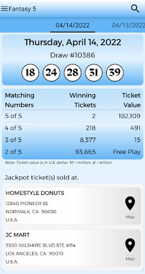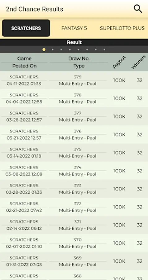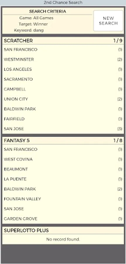 * Winning numbers search for Powerball (April 10, 2013 and later), Mega Millions (October 22, 2013 and later), Super Lotto Plus, Fantasy 5, Daily 4, Daily 3 (Midday), Daily 3 (Evening), and Daily Derby.