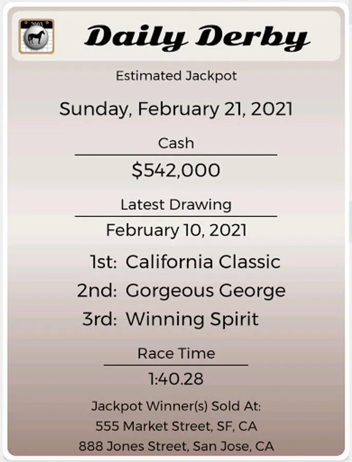 * 7-Day most recent draw details as well as up-to-720 past results for the following games: Powerball, Mega Millions, Super Lotto Plus, Fantasy 5, Daily 4, Daily 3 (Midday), Daily 3 (Evening), and Daily Derby