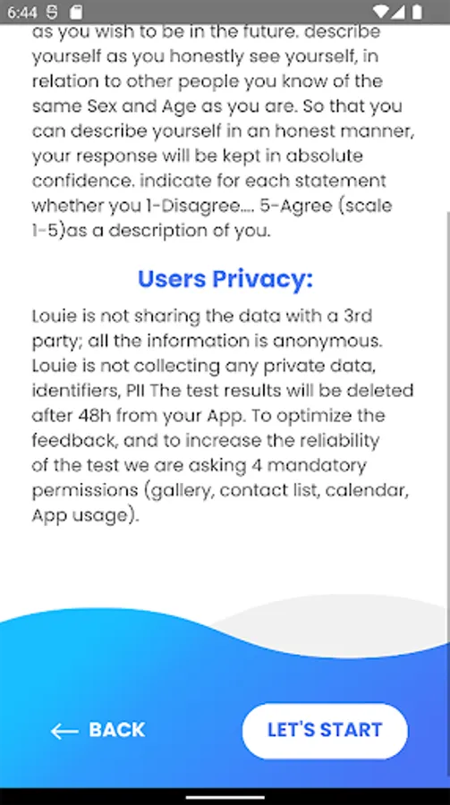 Louie's App would like to provide you the best and the most accurate personality analysis, therefore we would like to get the following permissions.