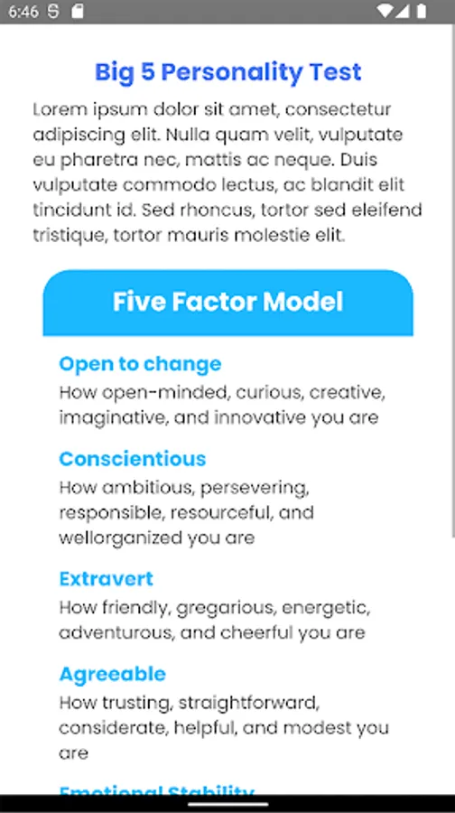 To give an accurate diagnosis and wide perspective of one's personality, this test scores people on five main traits, allowing you to know yourself better, and compared to others.