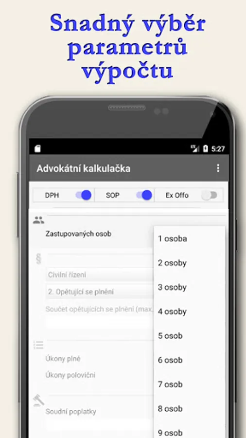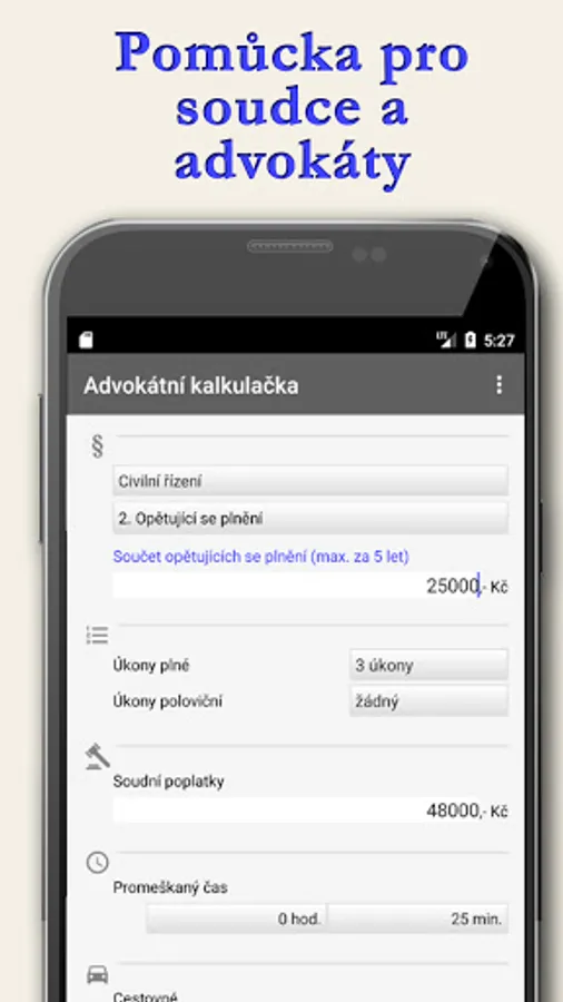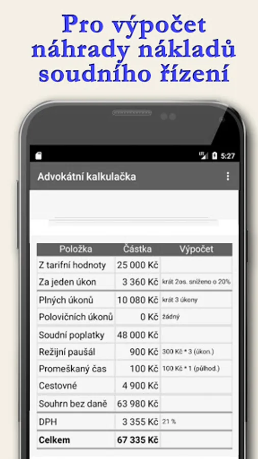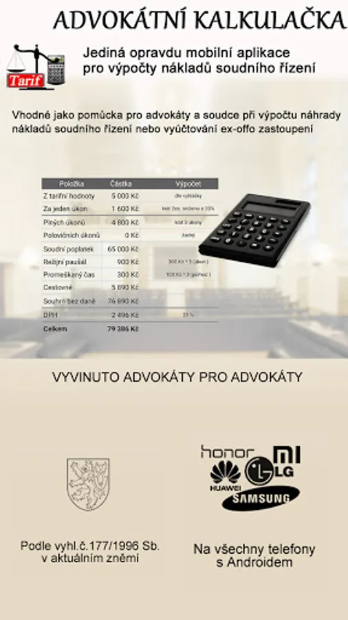 The application performs calculations according to the lawyer's tariff (Decree No. 177/1996 Coll.).