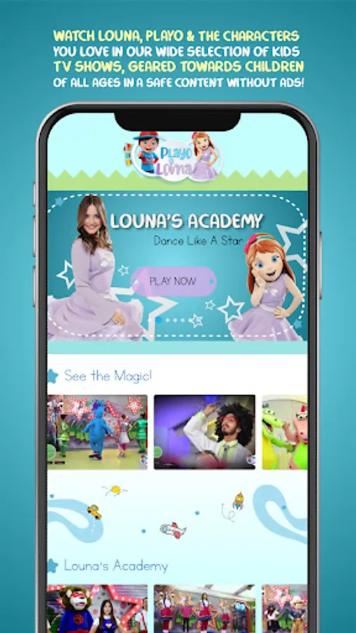 Playo & Louna App offers an entertaining and educational selection of kids TV shows without ads, that is 100% safe for kids and geared towards children of all ages. Our app stands out by having live artists, adorable mascots, and real puppets who interact with the children instead of graphically built characters.