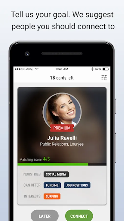 Lounjee connects you to people nearby you do not know yet who match your professional needs and interests.
