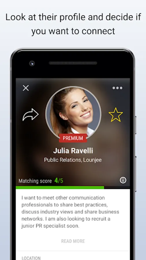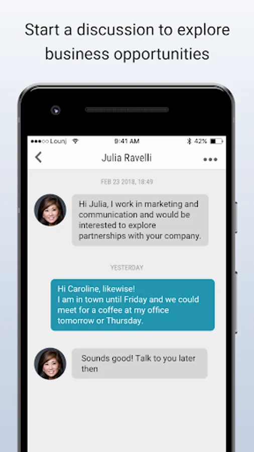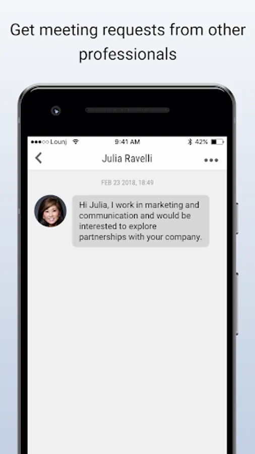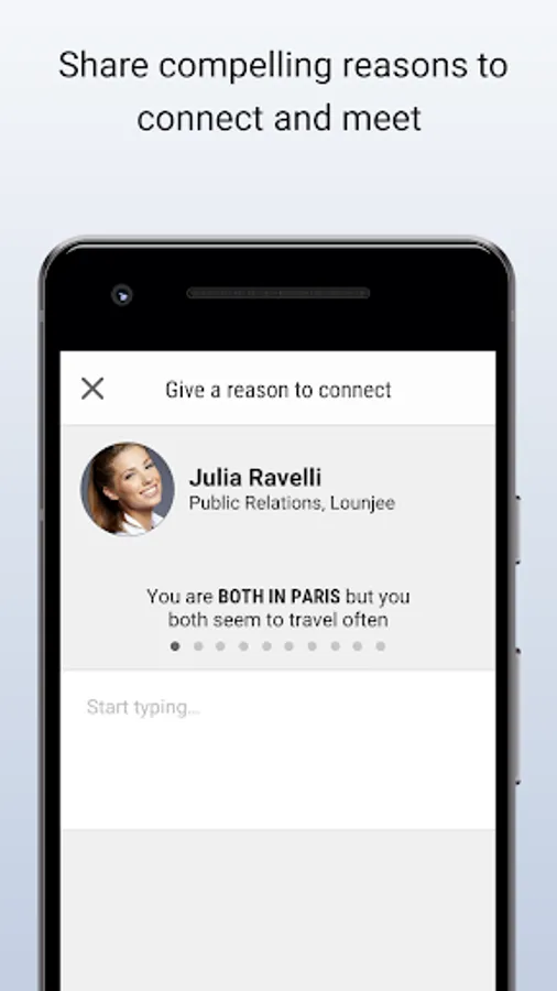 Lounjee’s algorithm takes location, goals and industry data to match you to professionals where mutual benefits surface. To make interaction easier, we’ll tell you for each profile the reasons you should connect.