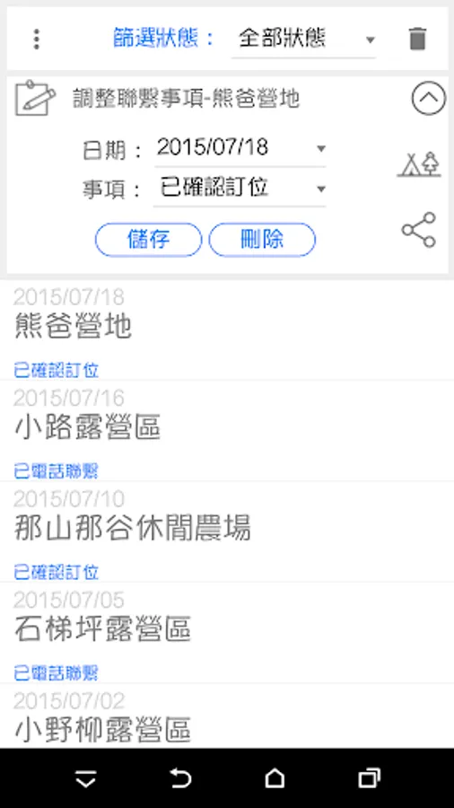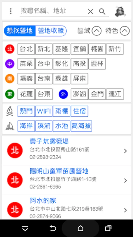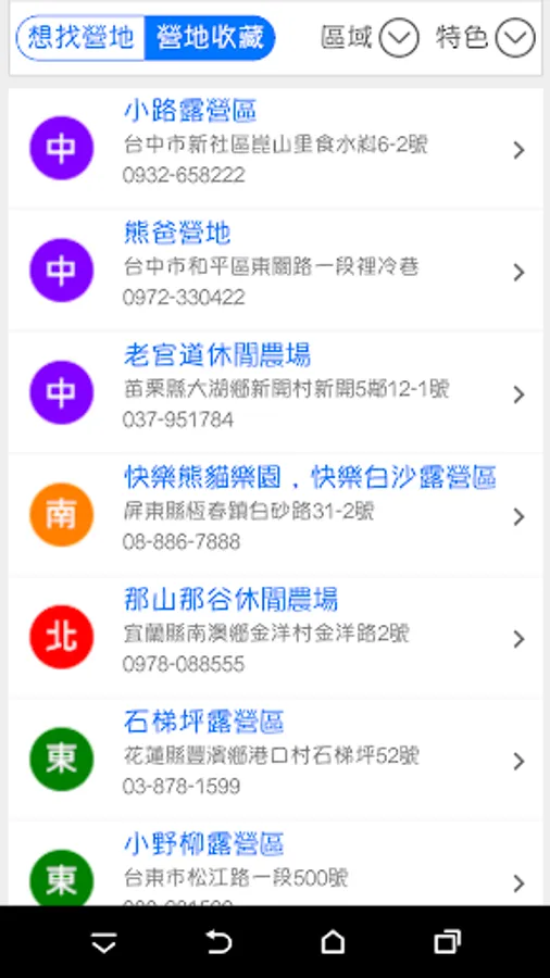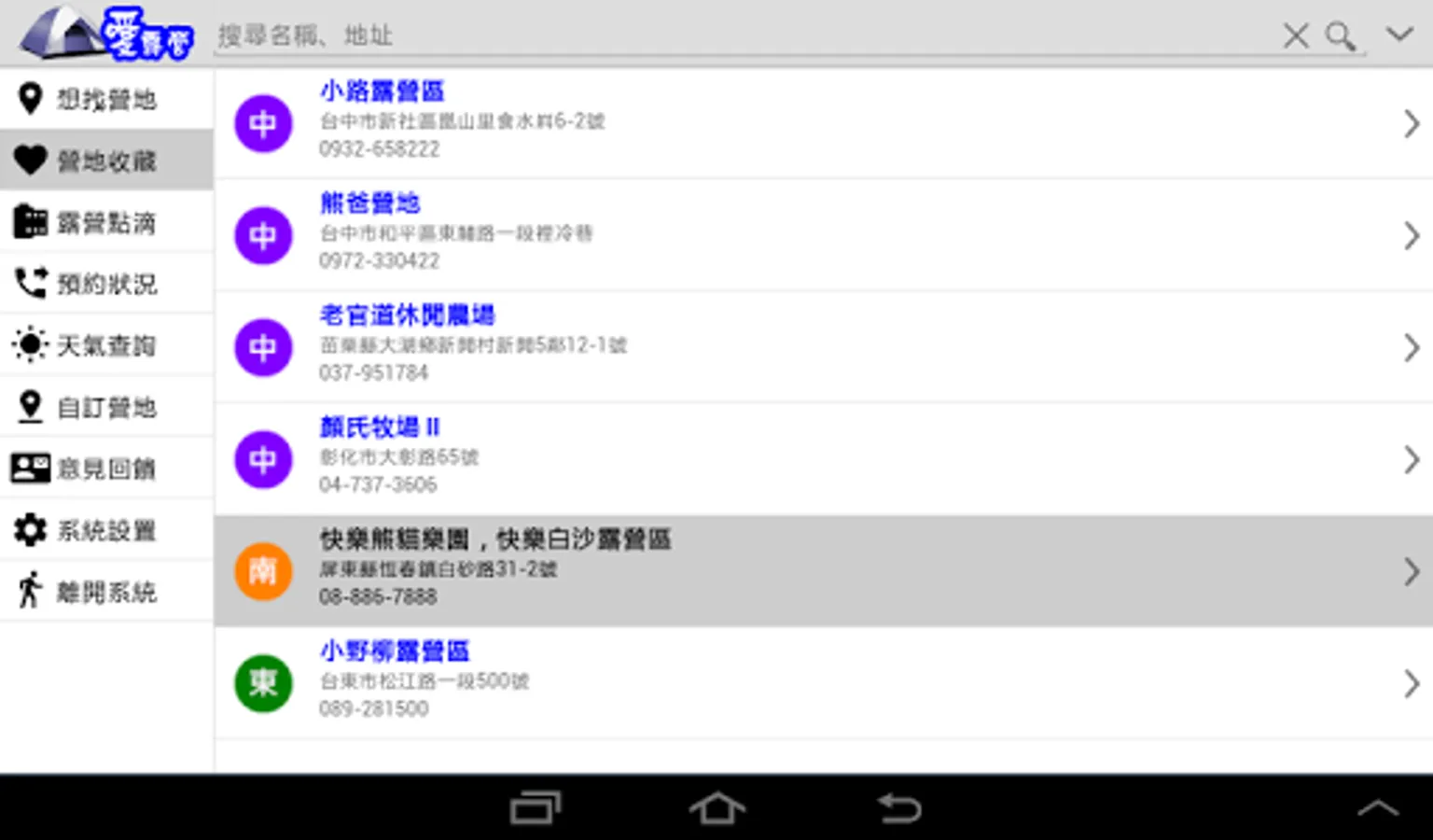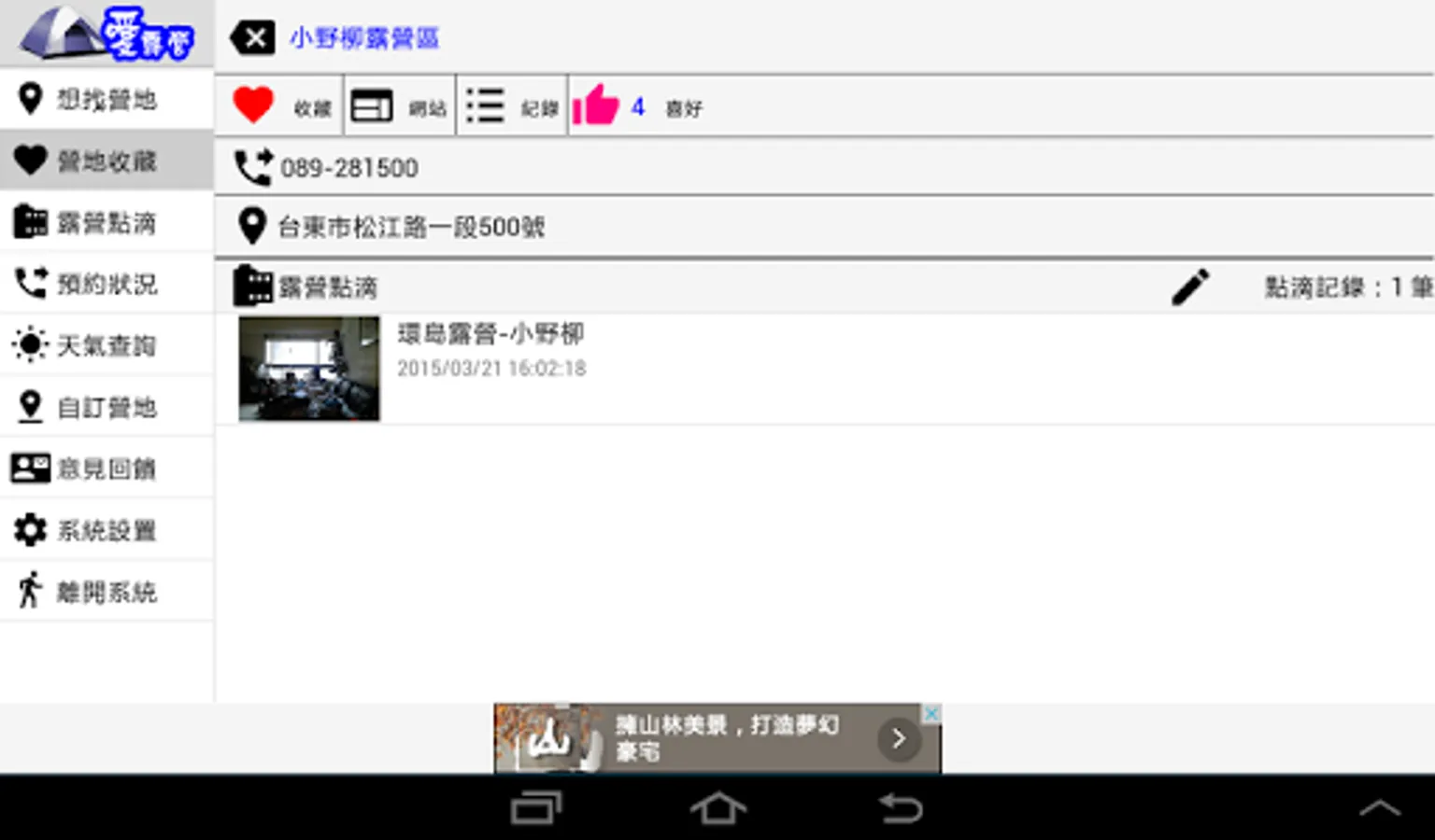 Browsing camp information, in addition to the page can click on the camp for further content, but also to inquire camp location and phone contact with the camps do. If you can not find your favorite campsite, you can do it yourself through custom campsite owners to build their own camp, so you do not miss anything worth visiting the camp.