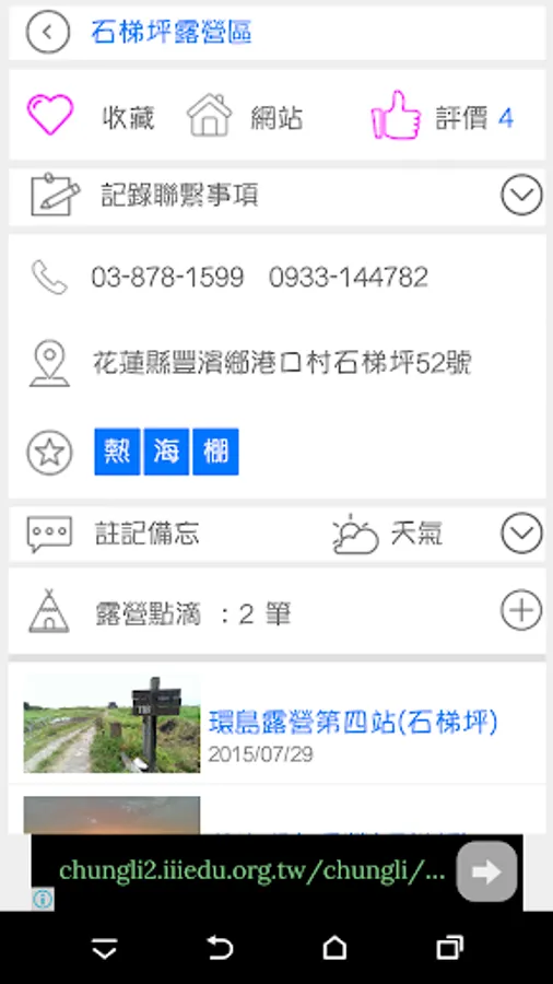- Quick description found camp after page of information on each camp, there are sensitive help you to more easily obtain detailed camp information, click on [website] can be linked camp description page, click on [address] can directly link to Google Maps Flag camp location, click [Phone] can make outgoing calls directly contact with the camp. Finally, as like the camp, but also can click the [collection] to join your camp favorites, shorten the next time to find the camp.
